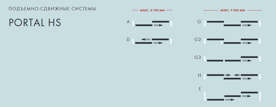 Створки перемещаются с применением подъемно выдвижного механизма. Нажатие на ручку приводит в действие створку, которая передвигается на необходимое расстояние. Создают комфортную, уютную обстановку, панорамный пейзаж. Оптимальный вариант для больших проемов, ширина до 19 000 мм.