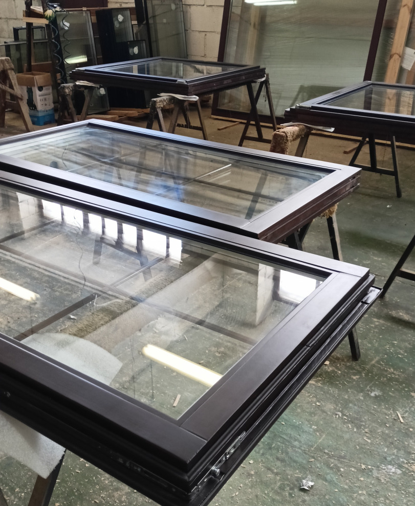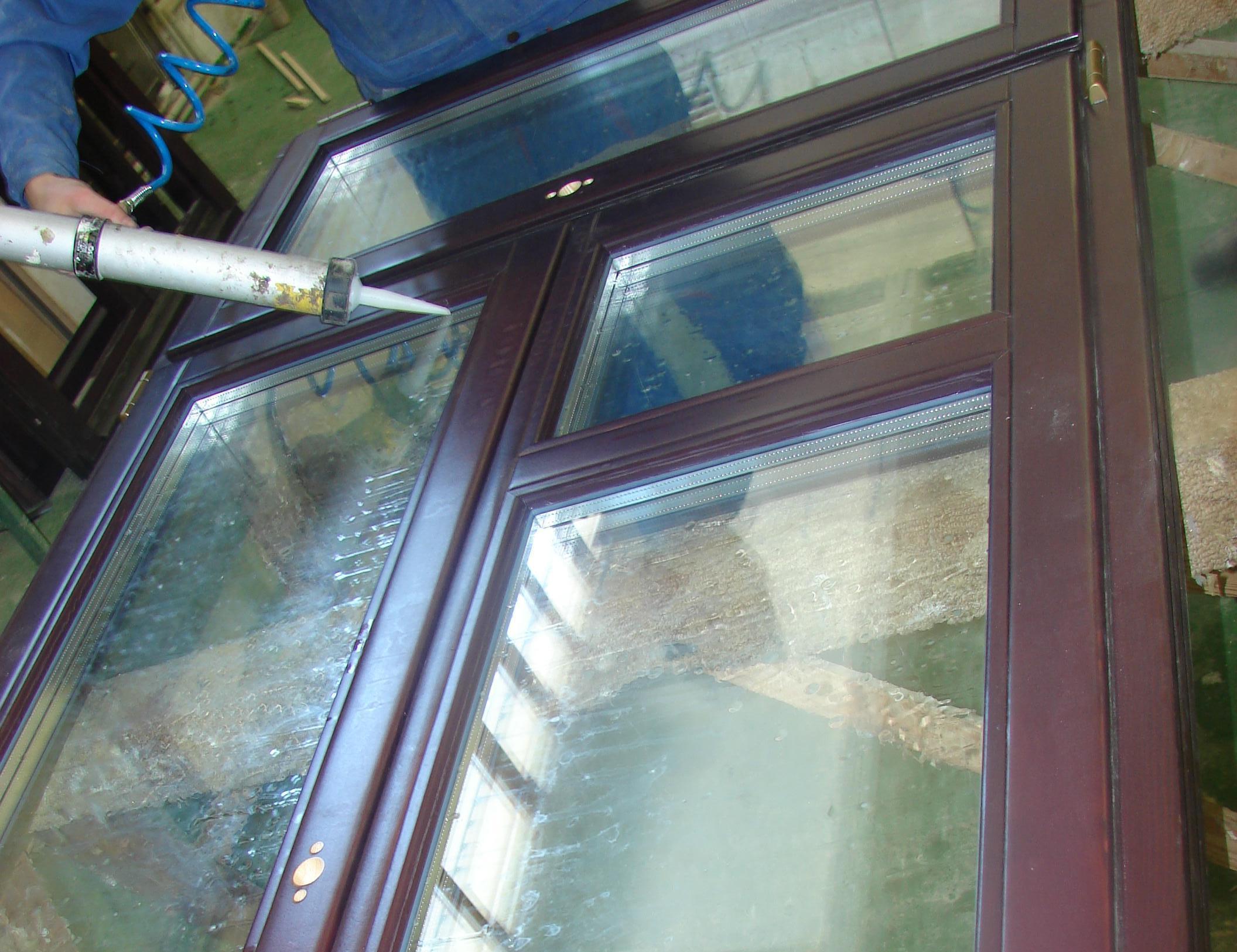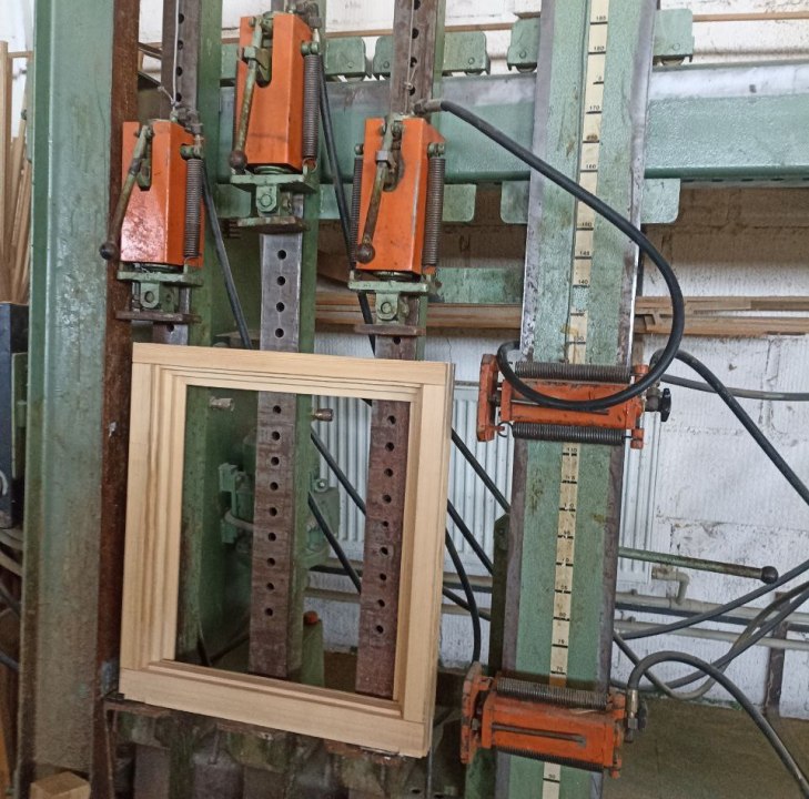 6. Далее на элементы для сборки наносят клей и в специальном прессе детали склеиваются, образуя будущую раму или створку.