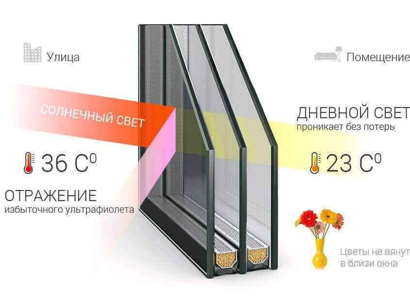 Тонировка защищает салон автомобиля от перегрева, смягчает яркий солнечный свет, изолирует от посторонних взглядов. Использование солнцезащитных оконных стеклопакетов распространено значительно меньше, но имеет все те же преимущества: в Ваши окна (террасу, веранду) никто не будет заглядывать, Вас не будет беспокоить обилие солнечных лучей (окна не ухудшают видимость, а приглушают свет, делая его комфортным для зрения), помещение будет меньше нагреваться, а мебель будет меньше выгорать на солнце.