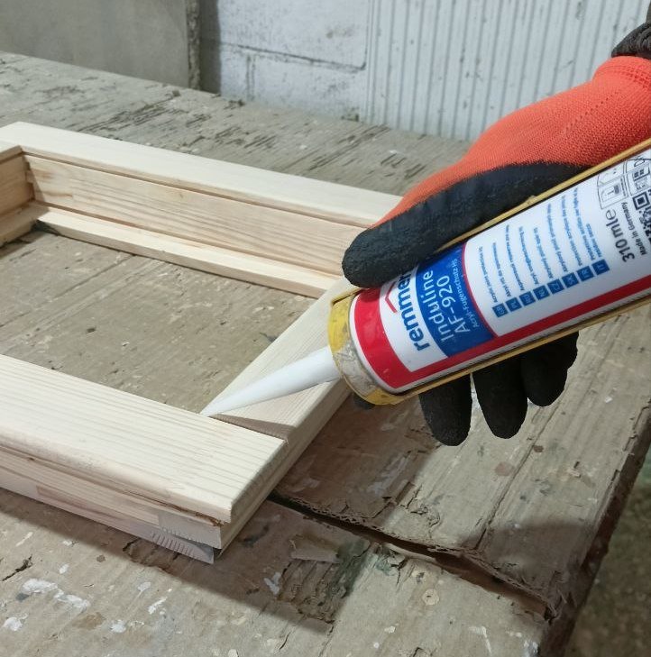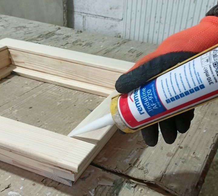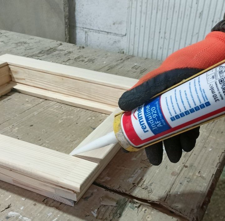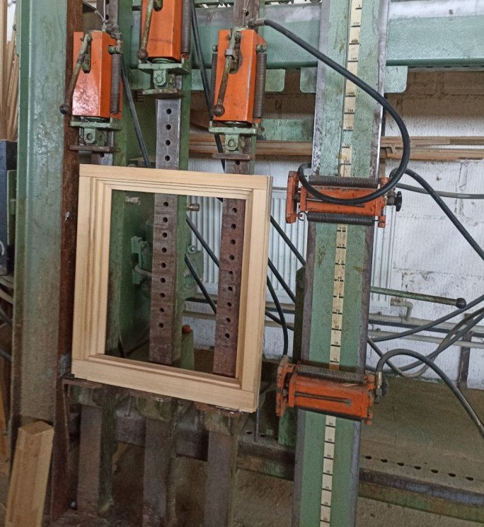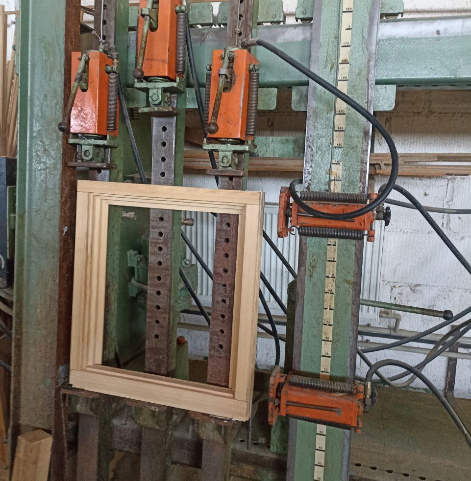 6. Далее на элементы для сборки наносят клей и в специальном прессе детали склеиваются, образуя будущую раму или створку.